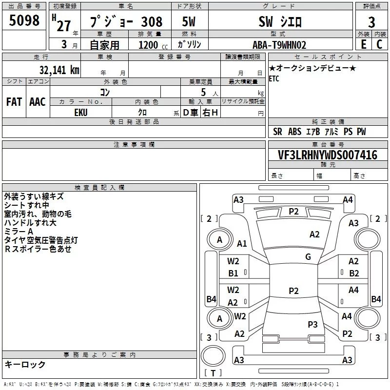 Peugeot 308 с аукциона Японии TAA Yokohama лот № 5098