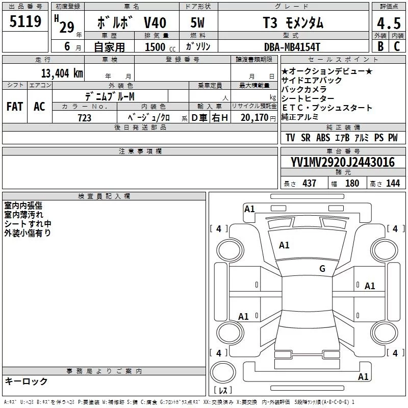 Volvo V40 с аукциона Японии TAA Yokohama лот № 5119