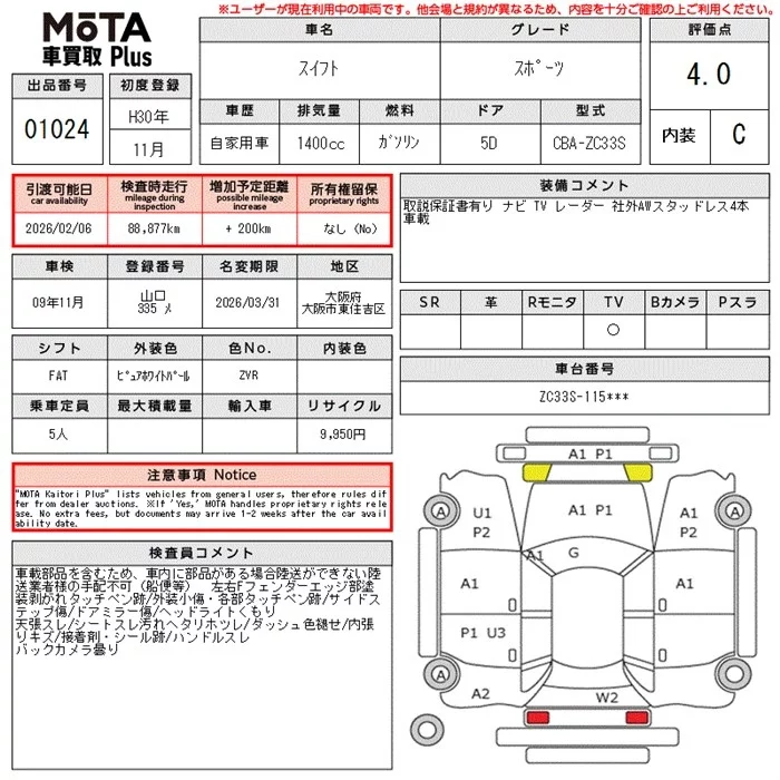 Suzuki SWIFT с аукциона Японии MOTA Kuruma Kaitori Plus лот № 1024