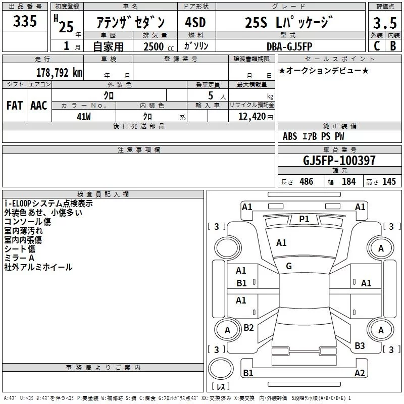 Mazda ATENZA SEDAN с аукциона Японии TAA Kinki лот № 335