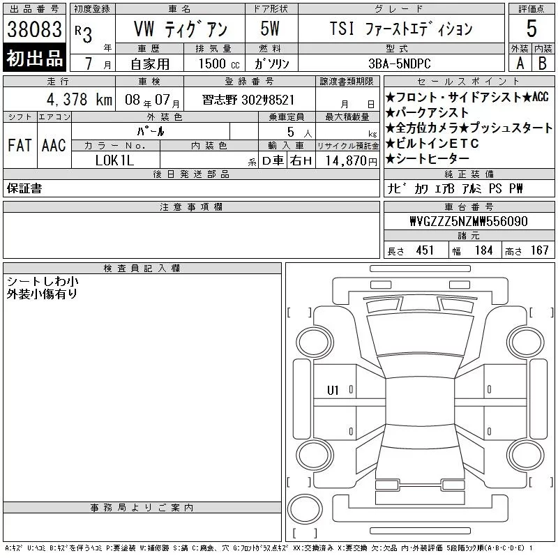 Volkswagen TIGUAN с аукциона Японии CAA Tokyo лот № 38083