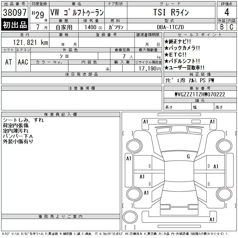 Volkswagen GOLF TOURAN с аукциона Японии CAA Tokyo лот № 38097