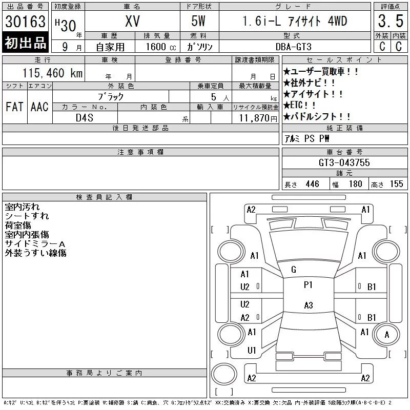 Subaru XV с аукциона Японии CAA Tokyo лот № 30163