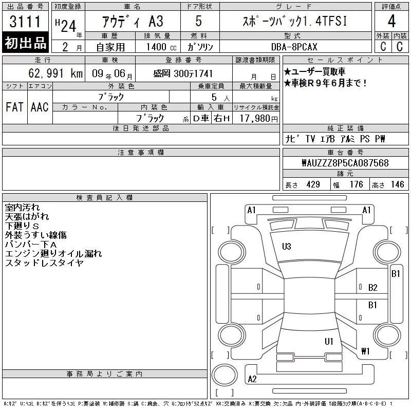 Audi A3 с аукциона Японии CAA Tohoku лот № 3111