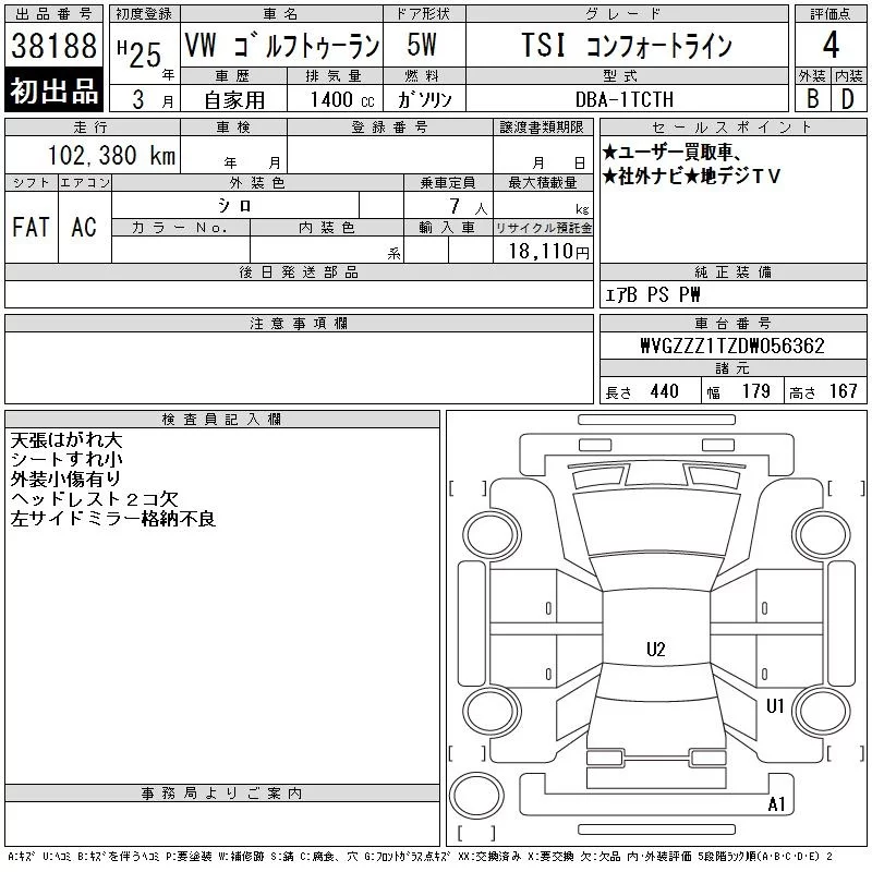 Volkswagen GOLF TOURAN с аукциона Японии CAA Tokyo лот № 38188
