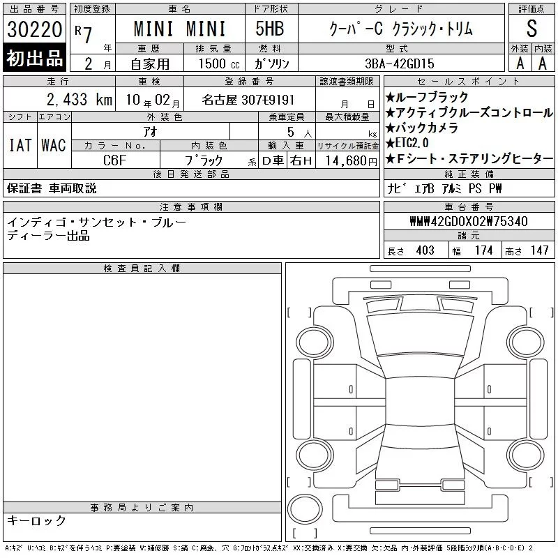 BMW MINI с аукциона Японии CAA Gifu лот № 30220