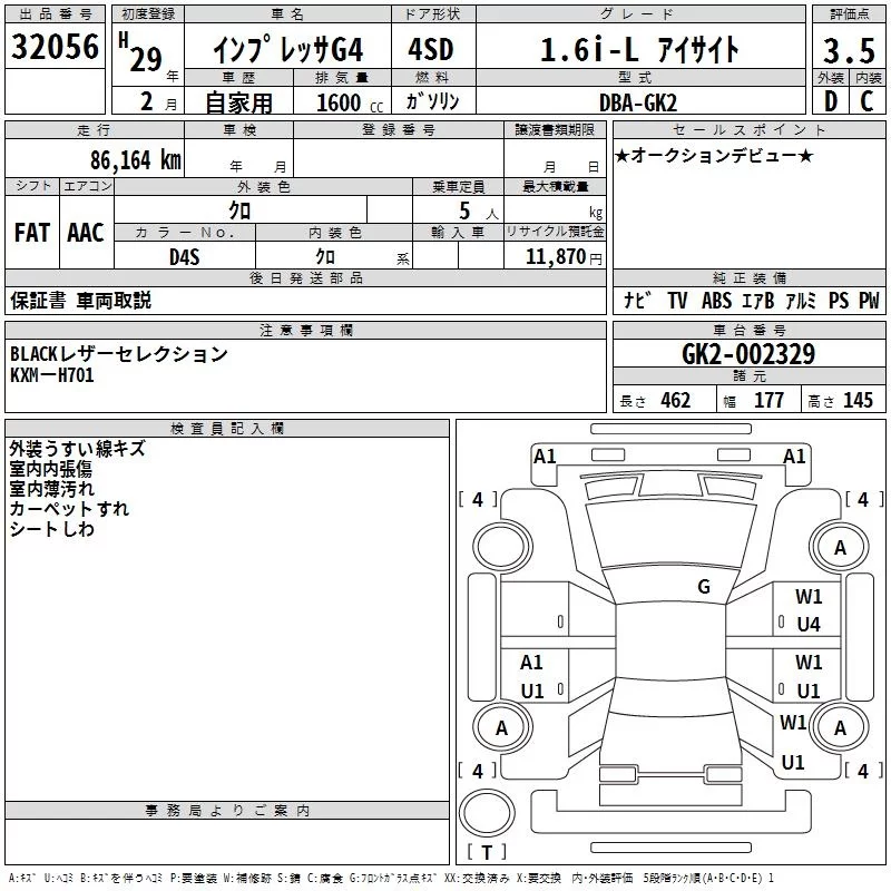 Subaru IMPREZA G4 с аукциона Японии TAA Kinki лот № 32056