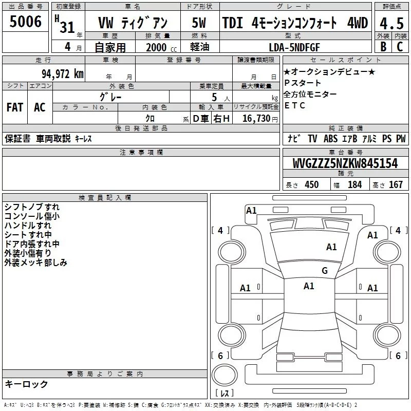 Volkswagen TIGUAN с аукциона Японии TAA Shikoku лот № 5006