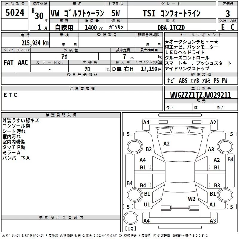 Volkswagen GOLF TOURAN с аукциона Японии TAA Kinki лот № 5024