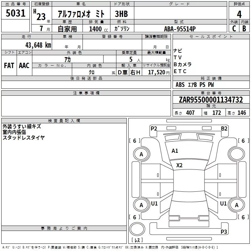 Alfa Romeo MiTo с аукциона Японии TAA Kinki лот № 5031