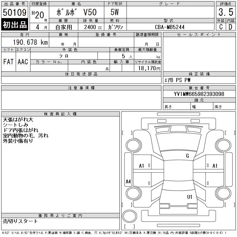 Volvo V50 с аукциона Японии CAA Tokyo лот № 50109