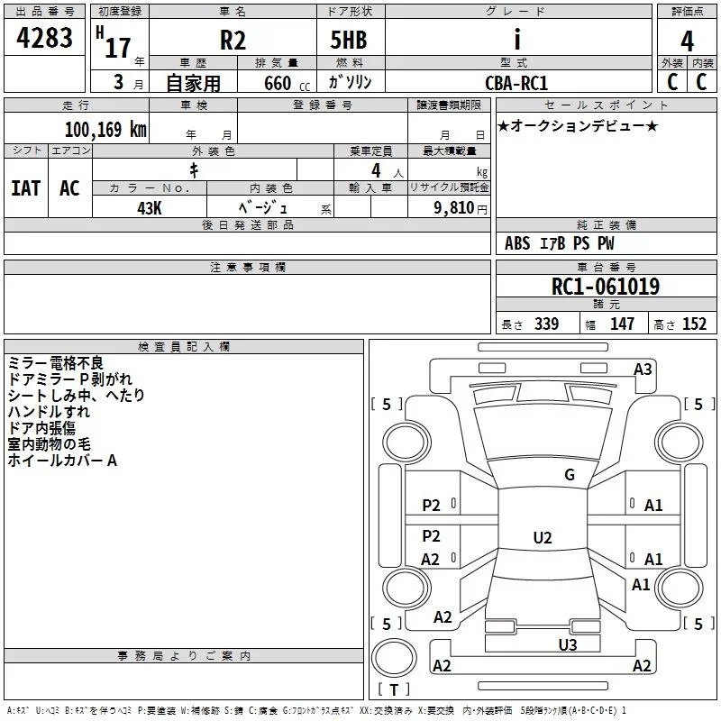 Subaru R2 с аукциона Японии TAA Shikoku лот № 4283