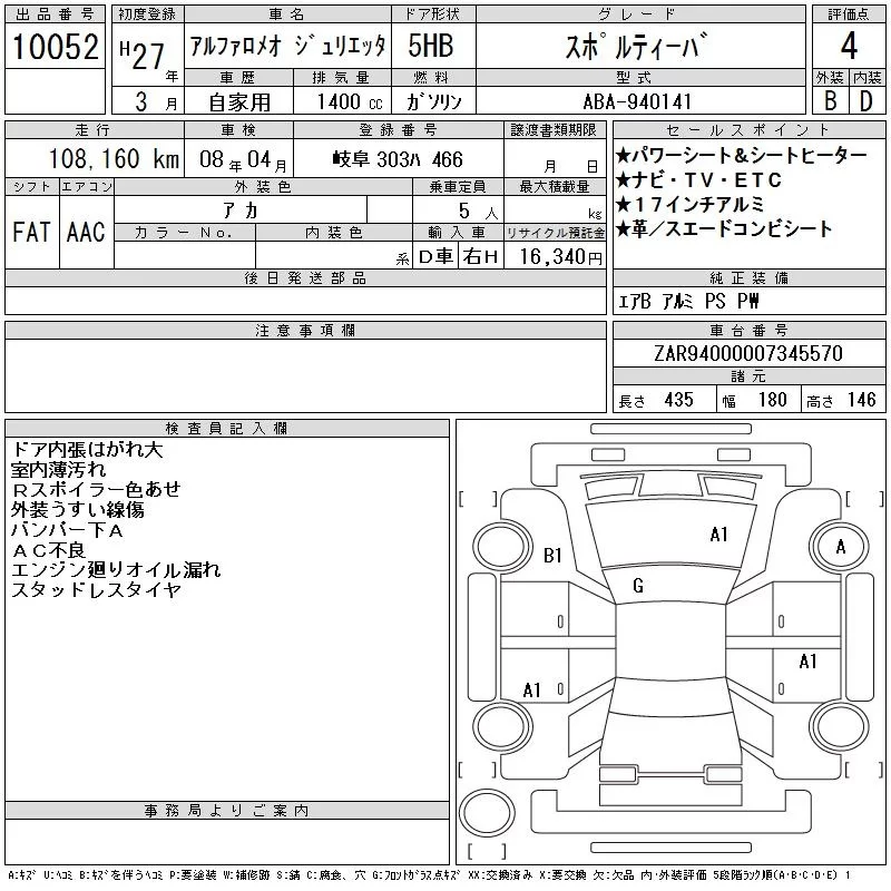 Alfa Romeo Giulietta с аукциона Японии CAA Gifu лот № 10052