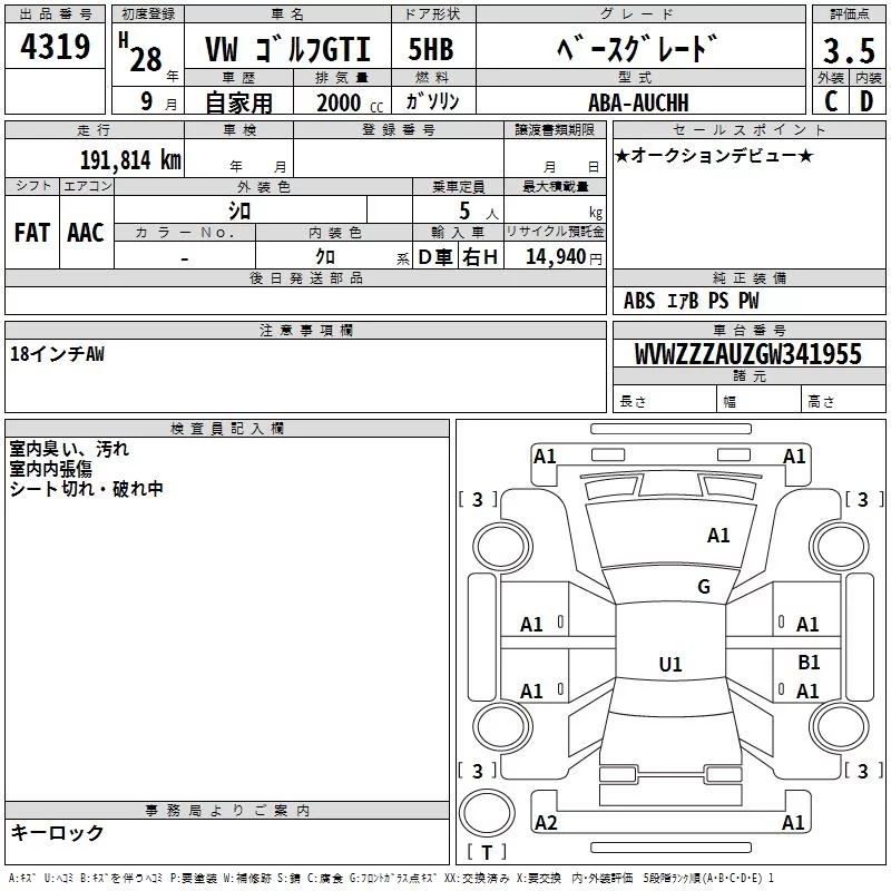Volkswagen GOLF с аукциона Японии TAA Kyushu лот № 4319