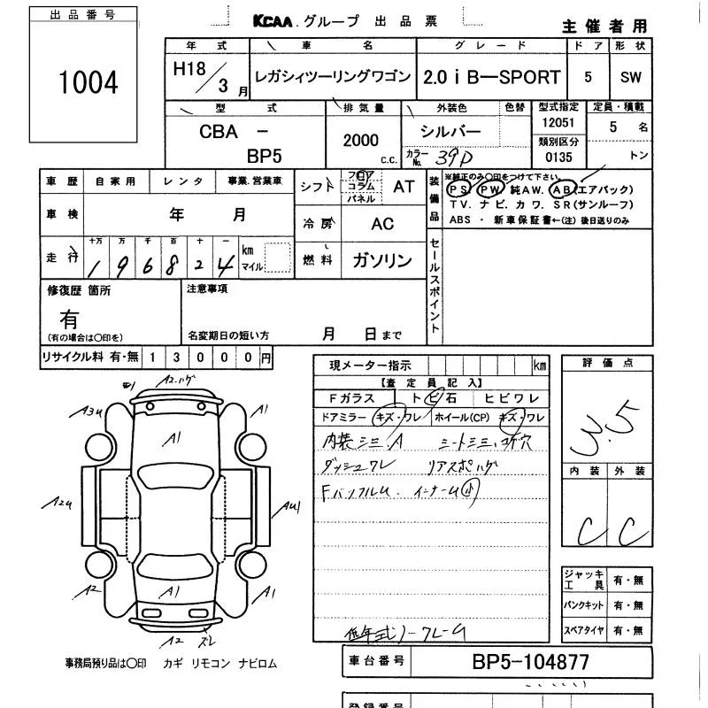 Subaru LEGACY с аукциона Японии KCAA Minami Kyushu лот № 1004