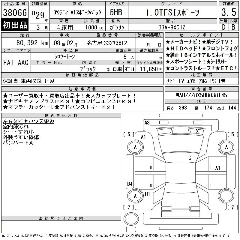 Audi A1 с аукциона Японии CAA Chubu лот № 38066