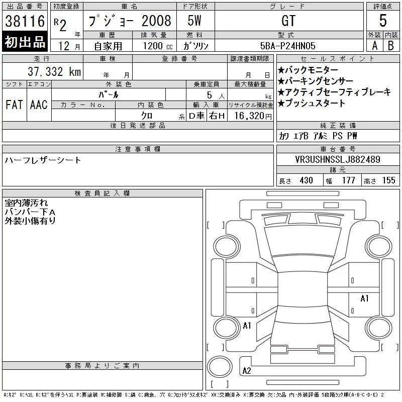 Peugeot 2008 с аукциона Японии CAA Chubu лот № 38116