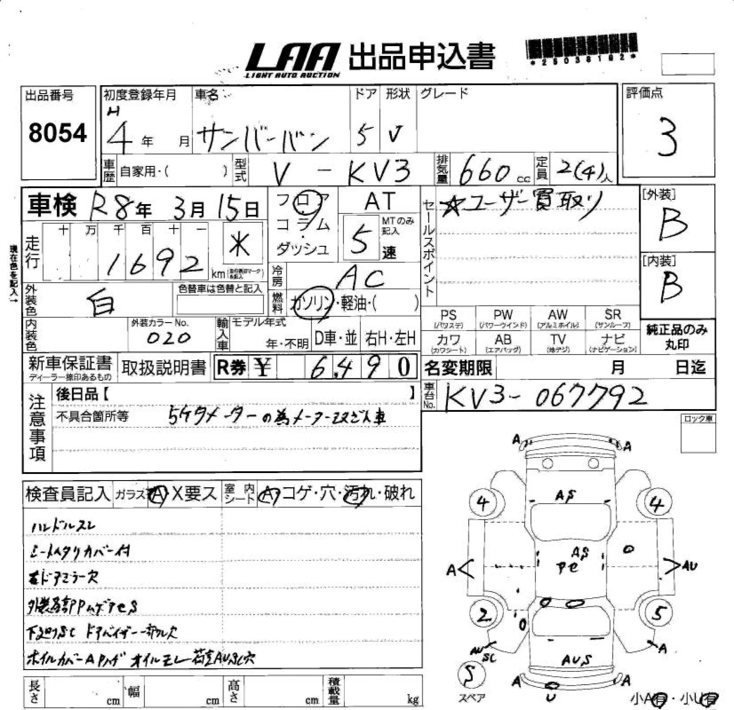 Subaru SAMBAR с аукциона Японии LAA Shikoku лот № 8054