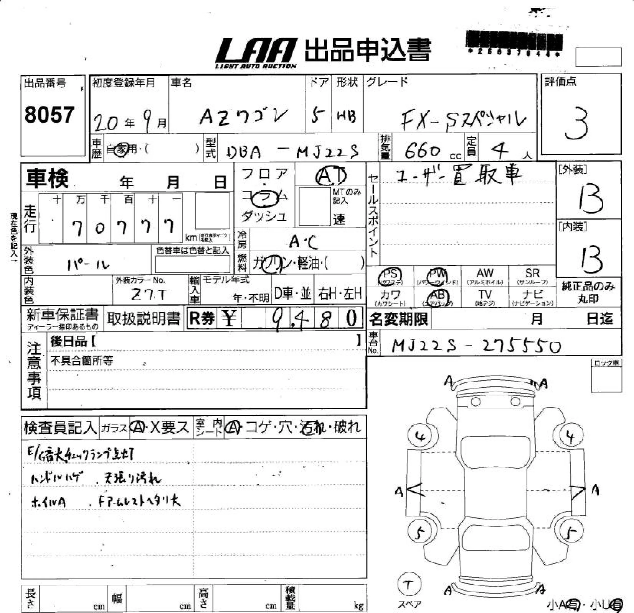 Mazda AZ WAGON с аукциона Японии LAA Shikoku лот № 8057