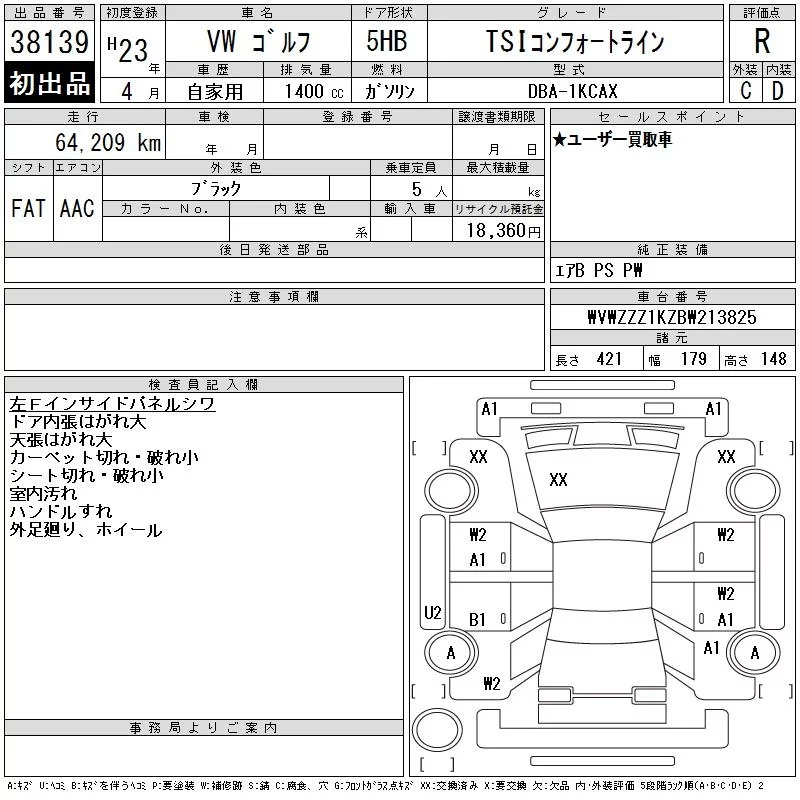 Volkswagen GOLF с аукциона Японии CAA Chubu лот № 38139