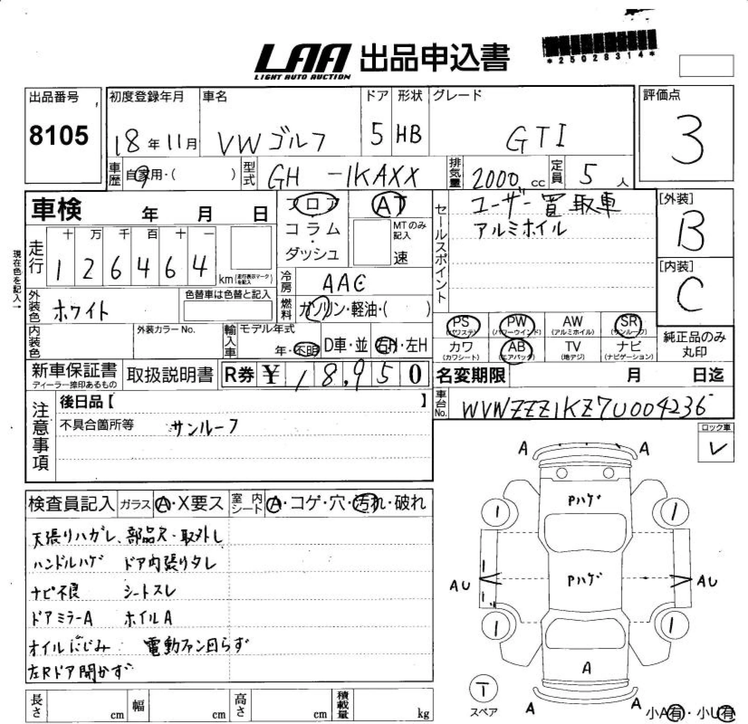 Volkswagen GOLF с аукциона Японии LAA Shikoku лот № 8105