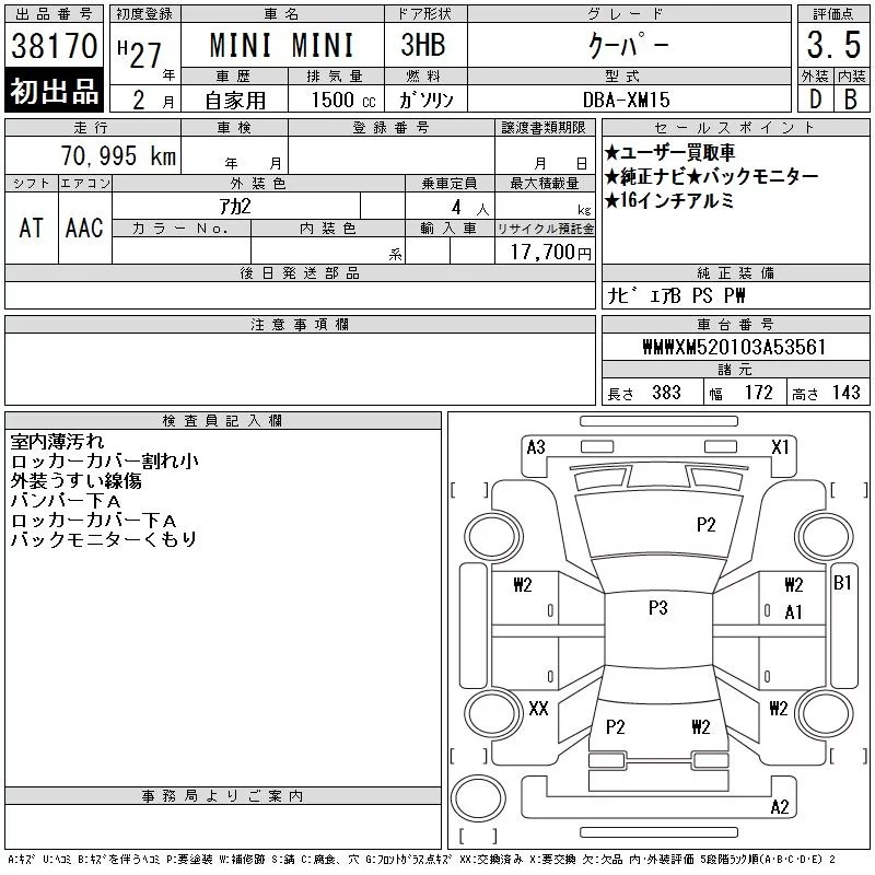 BMW MINI с аукциона Японии CAA Chubu лот № 38170