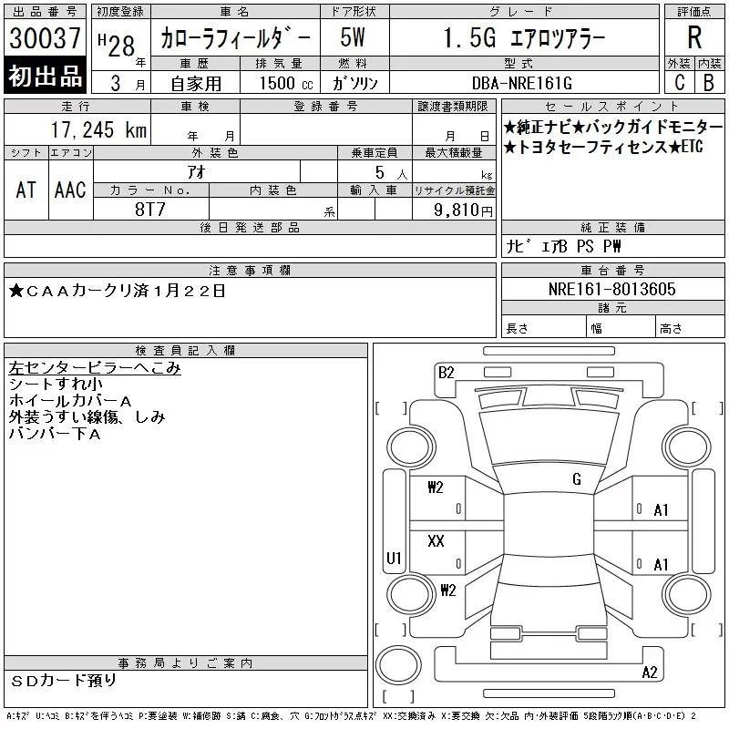 Toyota COROLLA FIELDER с аукциона Японии CAA Chubu лот № 30037
