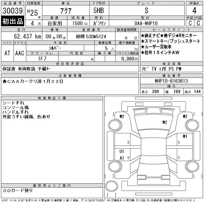 Toyota AQUA с аукциона Японии CAA Chubu лот № 30039