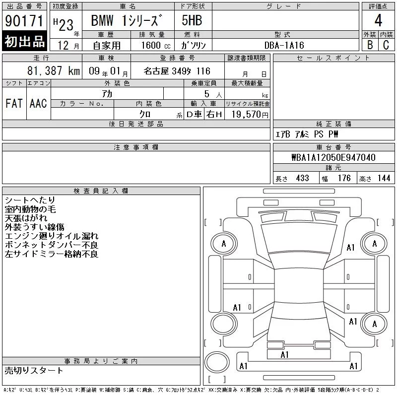 BMW 1-Series с аукциона Японии CAA Chubu лот № 90171