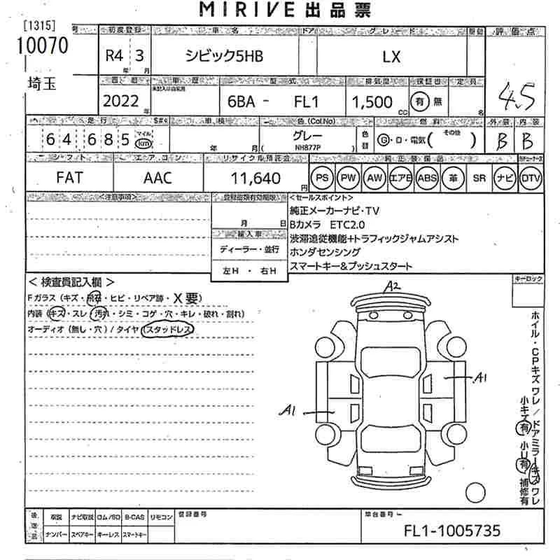Honda CIVIC с аукциона Японии MIRIVE Saitama лот № 10070
