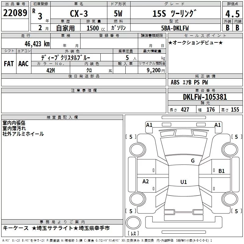 Mazda CX-3 с аукциона Японии TAA Kanto лот № 22089
