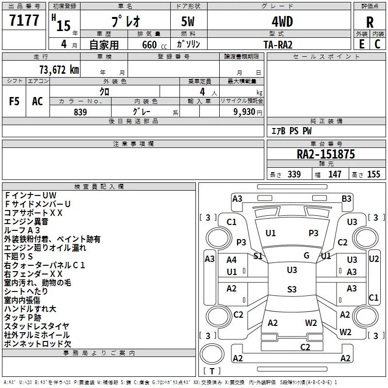 Subaru PLEO с аукциона Японии TAA Hokkaido лот № 7177