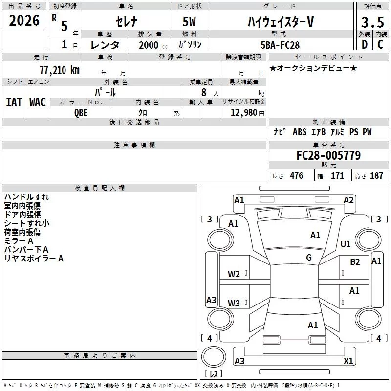 Nissan SERENA с аукциона Японии TAA Kanto лот № 2026