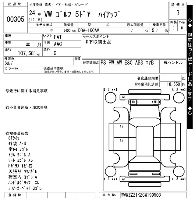 Volkswagen GOLF с аукциона Японии ARAI Oyama лот № 305