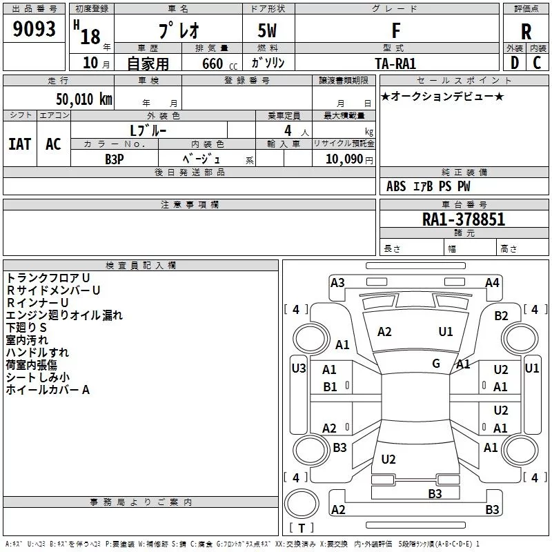 Subaru PLEO с аукциона Японии TAA Kanto лот № 9093