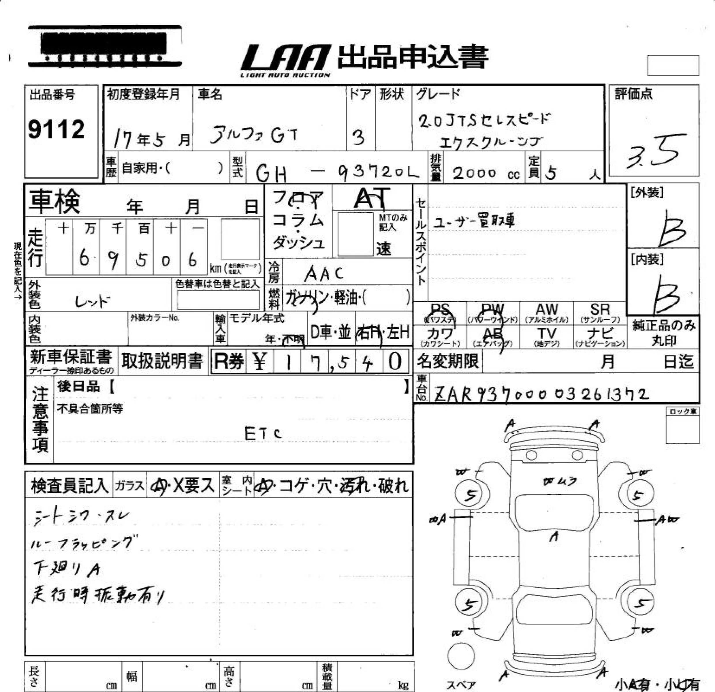 Alfa Romeo GT с аукциона Японии LAA Okayama лот № 9112