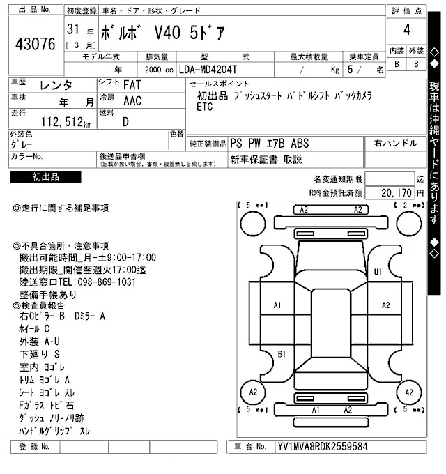 Volvo V40 с аукциона Японии ARAI Bayside лот № 43076
