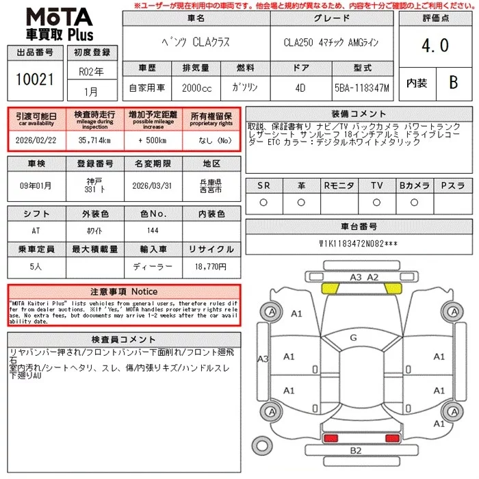 Mercedes-Benz CLA CLASS с аукциона Японии MOTA Kuruma Kaitori Plus лот № 10021