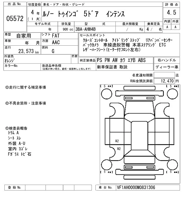 Renault TWINGO с аукциона Японии ARAI Bayside лот № 5572