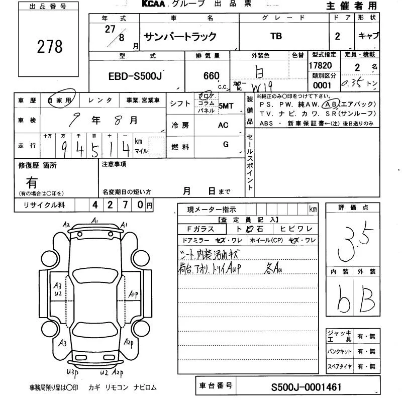 Subaru SAMBAR с аукциона Японии KCAA Yamaguchi лот № 278