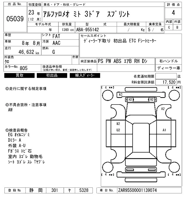 Alfa Romeo MiTo с аукциона Японии ARAI Bayside лот № 5039