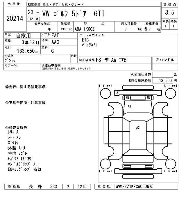 Volkswagen GOLF с аукциона Японии ARAI Oyama VT лот № 20214