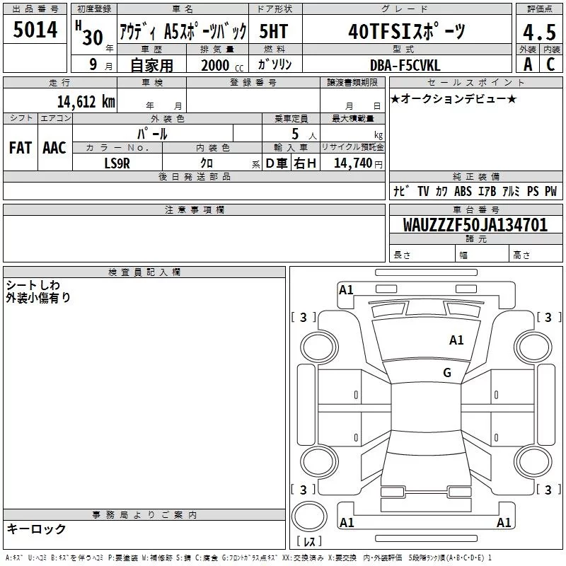Audi A5 с аукциона Японии TAA Yokohama лот № 5014