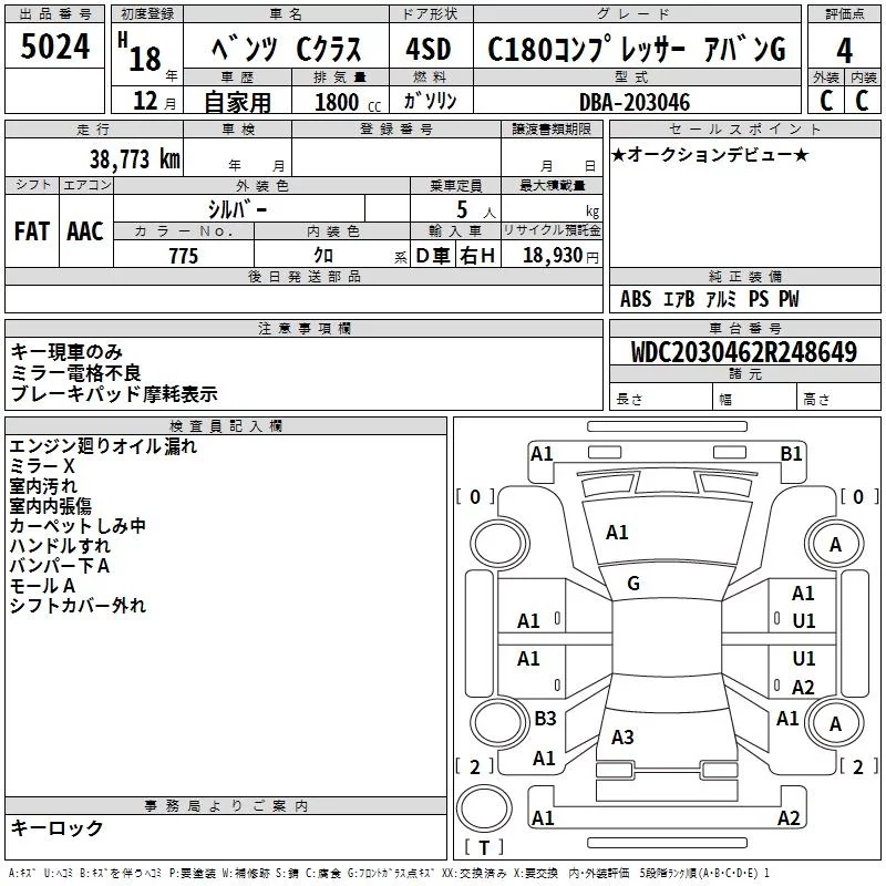Mercedes-Benz C CLASS с аукциона Японии TAA Yokohama лот № 5024