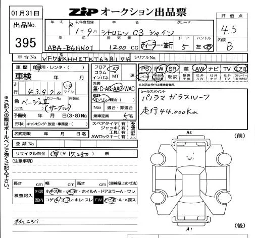 Citroen C3 с аукциона Японии ZIP Tokyo лот № 395