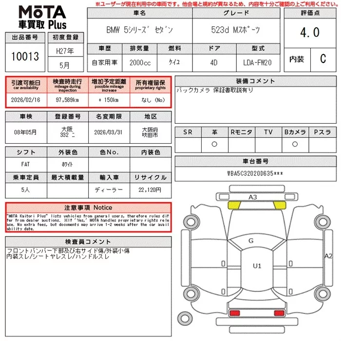 BMW 5-Series с аукциона Японии MOTA Kuruma Kaitori Plus лот № 10013
