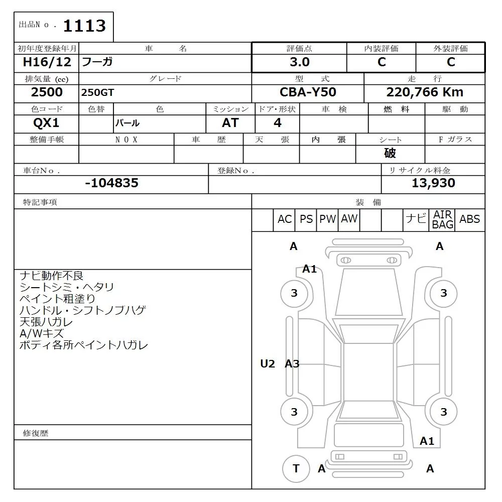 Nissan FUGA с аукциона Японии NISSAN Osaka лот № 1113