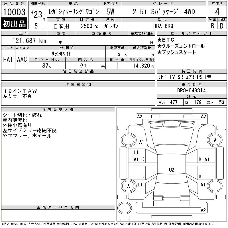 Subaru LEGACY с аукциона Японии CAA Tokyo лот № 10003