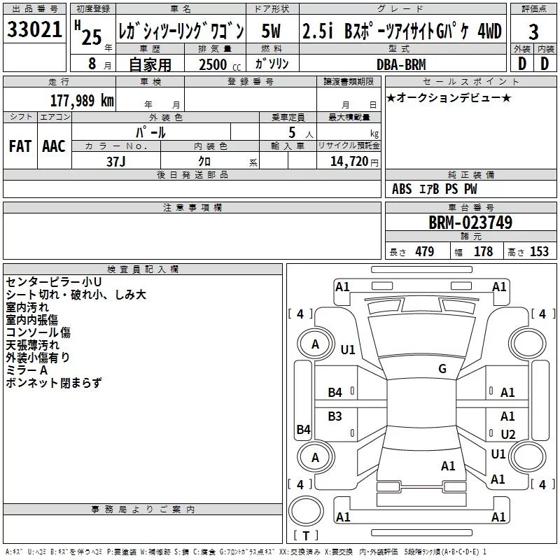 Subaru LEGACY с аукциона Японии TAA Kyushu лот № 33021