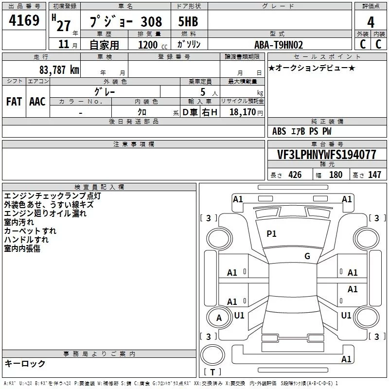 Peugeot 308 с аукциона Японии TAA Hiroshima лот № 4169
